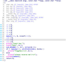 所以可以直接用32位IDA打开该文件,并按F5对main函数进行反汇编,得到对应的C语言伪代码。
