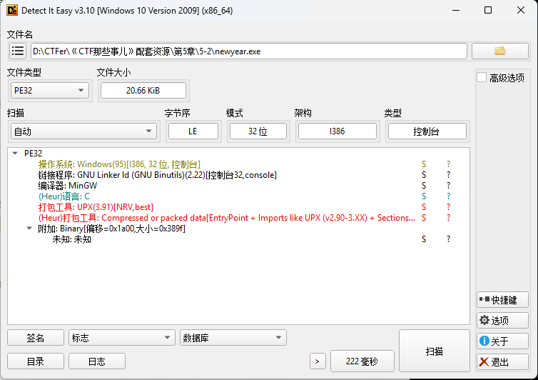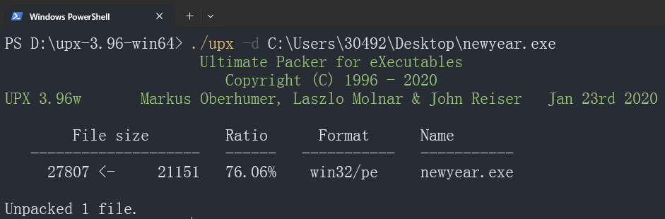 首先使用DIE对文件查壳,发现该文件具有压缩壳upx,所以使用对应脱壳工具对其进行脱壳。