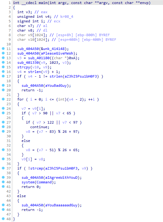 于是直接用32位IDA对文件进行反汇编,得到如下伪代码: