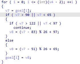 在这里可以看到,goal字符串进行了字母移位操作(右移14位),最终移位后的字符串要和aZ3h...对应字符串一致。