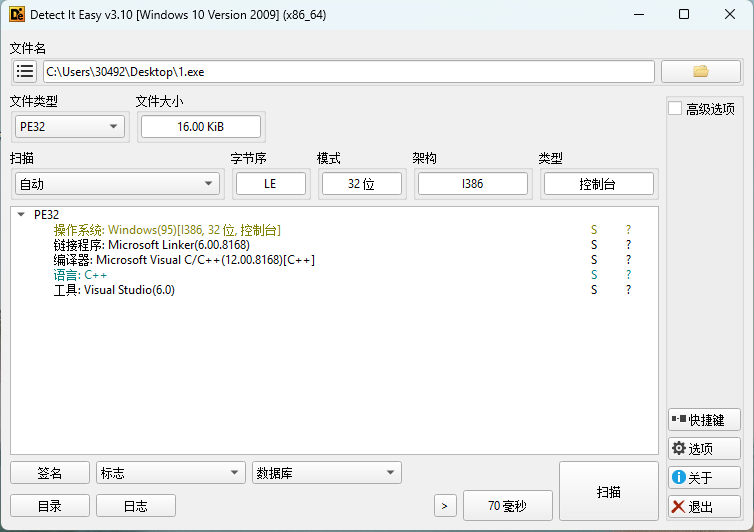 首先用DIE对文件查壳,发现是一个无壳的32位程序。