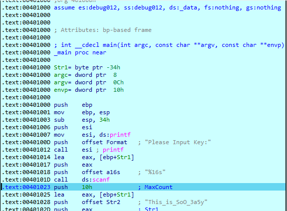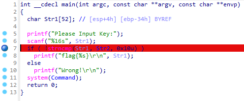 于是直接使用32位IDA打开该文件,按F5反汇编,得到伪代码,并在strcmp处按F2设置断点,效果如下: