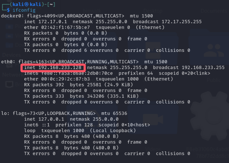 4.接着,用ifconfig查看网卡地址,并将其记录下来: