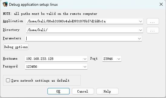 Application填你的文件路径,Directory填你文件所在的目录,Hostname填刚刚记录的网卡地址,Port对应着监听端口,Password对应设置的连接密码。
