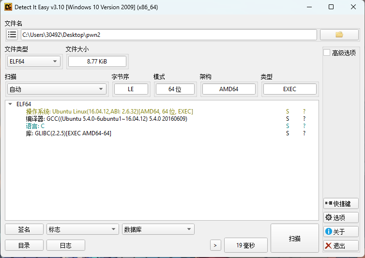 首先用DIE对文件进行查壳,发现这是无壳的64位ELF文件。