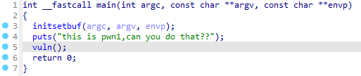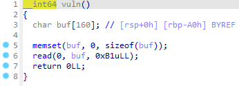 查看vuln函数,发现其中有read函数可以利用(buf长度只有160,但是read可以修改的长度有177),于是考虑栈溢出漏洞。