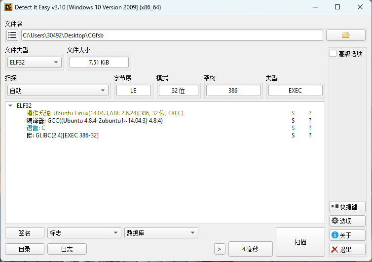 首先使用DIE对文件进行查壳,发现这是一个无壳的32位ELF文件。