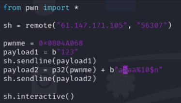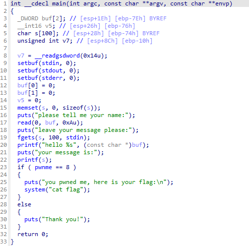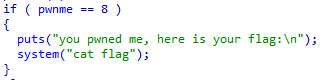 这时候,我们就可以考虑利用格式化字符串漏洞,向pwnme地址注入数字8。