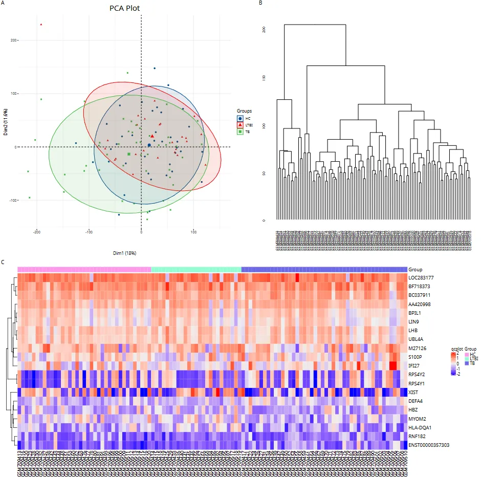 qcplot为自定义函数,作用是绘制用于质控判断的图,如PCA、top20基因热图、树状图,PCA图,可以三组区别区别不明显,可以考虑直接用作者处理好的数据虽然后负数值