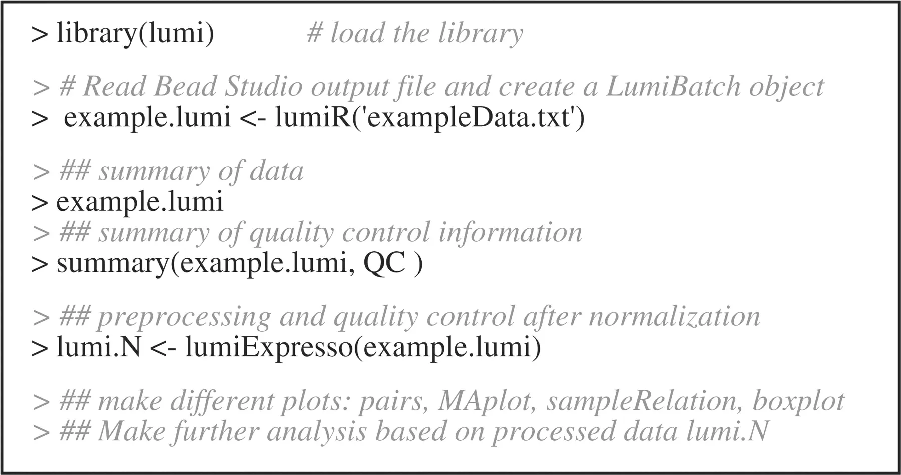 lumi代码主要两个步骤,读入数据和lumiExpresso(包括lumiB调整芯片背景;lumiT 对数据进行方差固定;lumiN 对方差固定后的数据进行标准化,lumiQ 评估数据质量。所有这些方法构成了一个预处理流程),可以参考lumi包发表的文章 PMID: 18467348