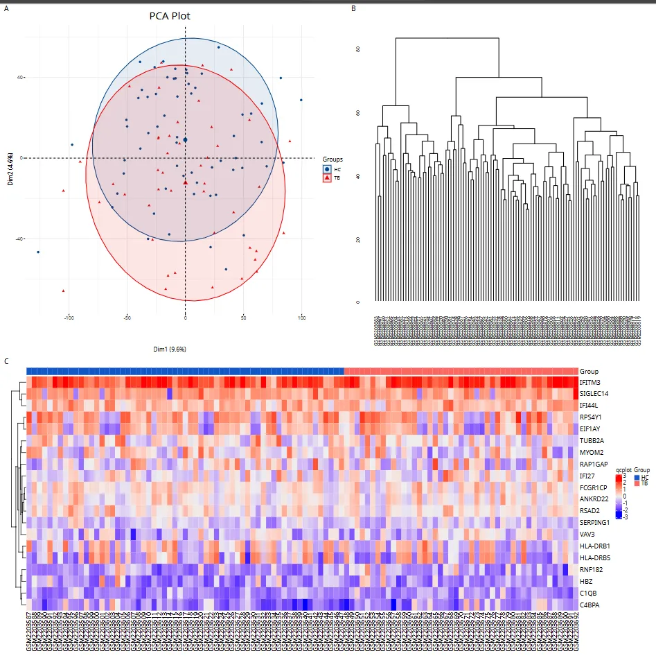 qcplot为自定义函数,作用是绘制用于质控判断的图,如PCA、top20基因热图、树状图,PCA图,可以 2 组区别区别不明显,可以考虑直接用作者处理好的数据虽然 有 负数值