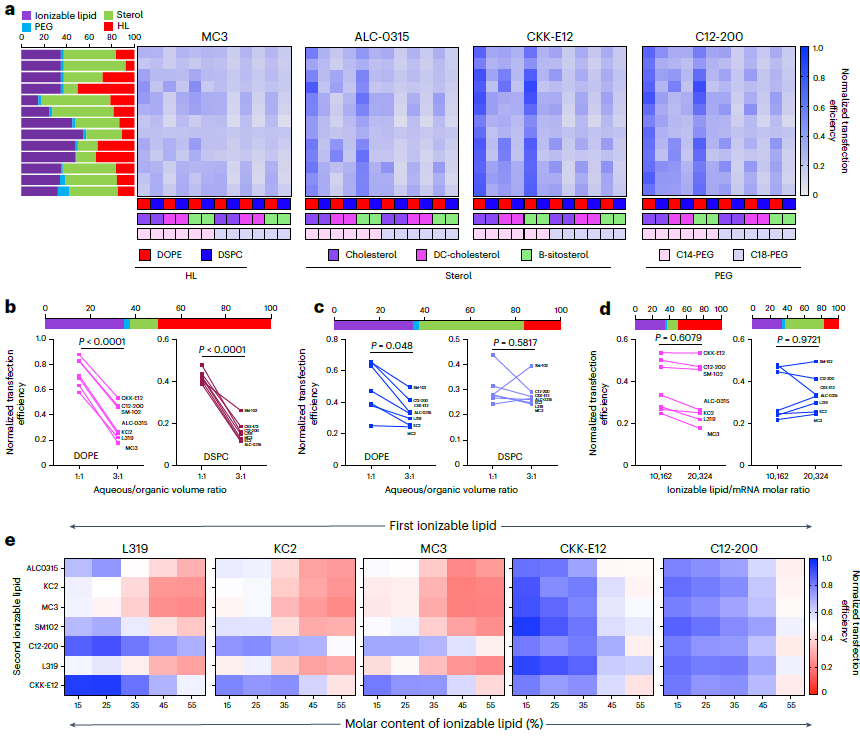 ● 2b/c:水 / 有机相比的影响依赖辅助脂质含量。高辅助脂质含量时,水 / 有机相比从 3:1 改为 1:1 会显著提升效能(2b);低辅助脂质含量时该影响减弱(2c),DSPC 基配方中此影响可忽略。
