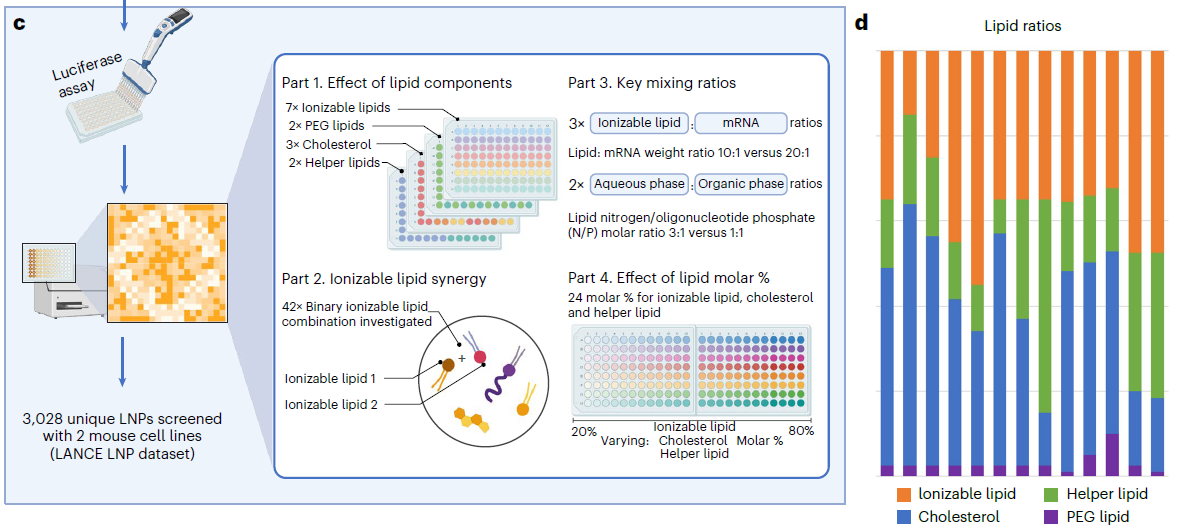 核心规模与测试体系:通过高通量自动化流体处理平台合成 LNP,共生成3028 种独特 LNP、超 6000 个标记数据点,均封装萤火虫荧光素酶 mRNA,在小鼠 DC2.4 和 B16-F10 两种细胞系中测试,以生物发光读数量化转染效能,为模型提供细胞特异性的效能标签。
