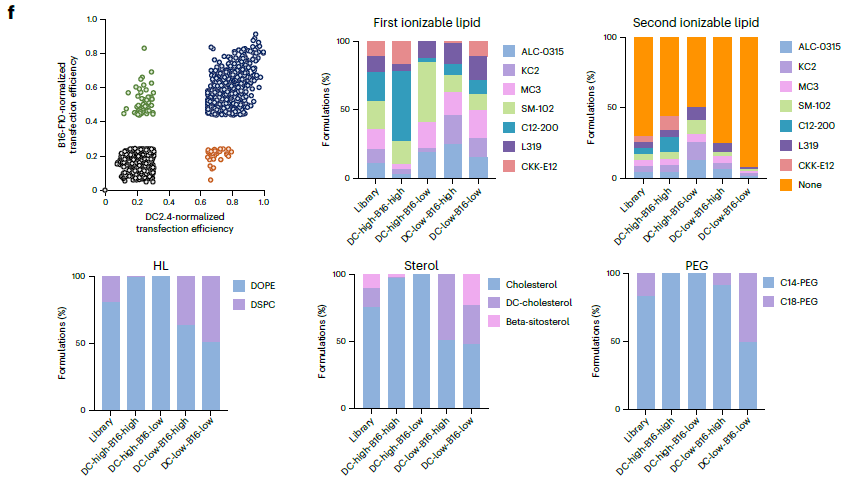● 2f:LNP 效能的跨细胞系特异性。DC2.4 和 B16-F10 细胞仅有 772 种配方为双高效;SM102 适配 DC2.4、DC - 胆固醇适配 B16-F10,证实不同细胞系需针对性优化配方。