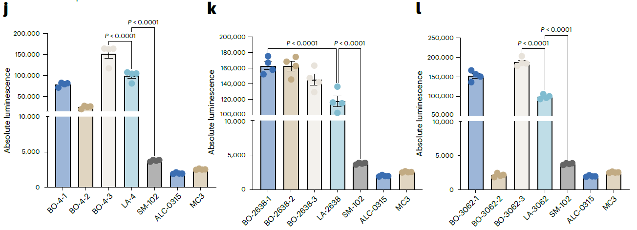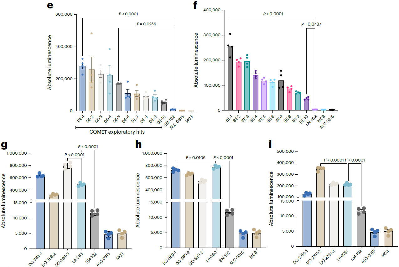 - 3e/f:探索性命中物体外验证。COMET 筛选的命中物在 DC2.4/B16-F10 细胞中效能显著优于 SM-102/MC3 等临床基准配方。