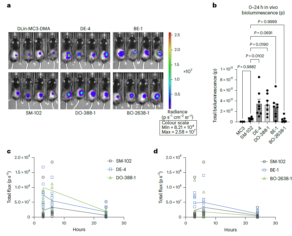 - 5a:小鼠体内 6h 生物发光成像。COMET 设计的 DE-4/BE-1/DO-388-1 等配方,生物发光信号显著强于 SM-102/MC3,说明体内转染效能更高。