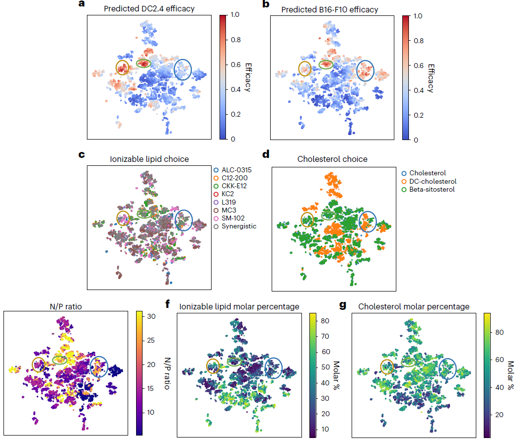 - 6a-g:10000 个虚拟 LNP 的 t-SNE 可视化。高效 LNP 在特征空间形成明显的聚类分布,且存在双细胞系高效的通用聚类(绿色)、DC2.4 专属聚类(黄色)、B16-F10 专属聚类(蓝色);聚类与离子 izable 脂质选择、DC - 胆固醇含量、N/P 比(25-30 为优)、离子 izable 脂质摩尔比(<50% 为优)高度相关。
