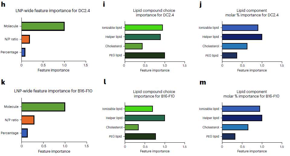 - 6h-j:DC2.4 细胞的特征重要性。脂质身份是最核心影响因素,其次是 N/P 比、摩尔比例;脂质类别中 PEG 脂质(C14-PEG 最优)、可电离脂质选择最重要,摩尔比例中离子 izable / 辅助脂质占比影响最大。