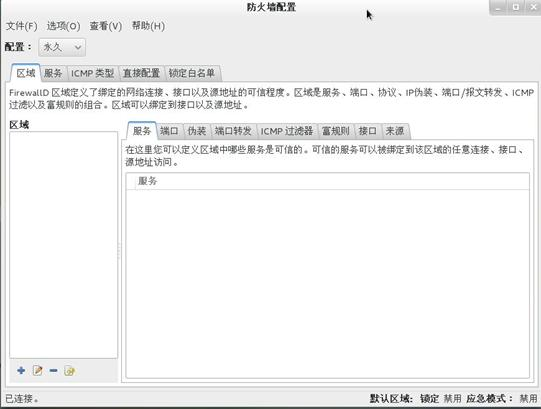 firewall-config 工作界面分成三个部分:上面是主菜单,中间是配置选项卡。下面是区域、服务、ICMP 端口、白名单等设置选项卡。最底部是状态栏(状态栏显示四个信息:从左到右以此是连接状态、默认区域、锁定状态、应急模式)。说明:在左下方角落寻找“已连接”字符,这标志着 firewall-config工具已经连接到用户区后台程序 firewalld。注意,ICMP 类型、直接配置 (Direct Configuration)和锁定白名单 (Lockdown Whitlist)标签只在从 查看下拉菜单中选择之后才能看见。