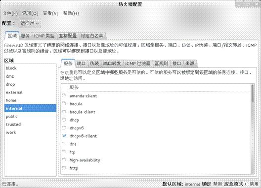 网络或者防火墙区域定义了连接的可信程度。firewalld 提供了几种预定义的区域。区域配置选项和通用配置信息可以在 firewall.zone(5) 的手册里查到。这里的区域是服务、端口、协议、伪装、ICMP 过滤等组合的意思。区域可以绑定到接口和源地址。服务子选项卡定义哪些区域的服务是可信的。可信的服务可以绑定该区的任意连接、接口、和源地址,配置界面见图 4。