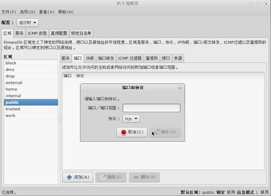 要允许流量通过防火墙到达某个端口,则启动 firewall-config 并选择您想更改设定的网络区域。选择 端口 图标并点击右边的 添加 按钮,Port and Protocol 就打开了。