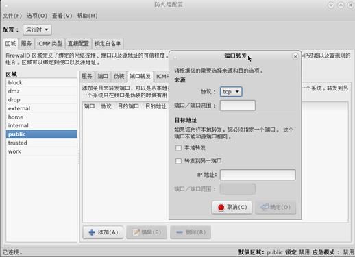 firewall-config 支持防火墙的所有特性。管理员可以用它来改变系统或用户策略。通过 firewall-config 用户可以配置防火墙允许通过的服务、端口 、伪装 、端口转发 、和 ICMP 过滤器和调整 zone(区域)设置等功能以使防火墙设置更加的自由、安全和强健。firewall-config 工作界面见图 3。