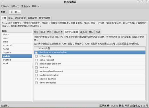 要使用或者禁用一个 ICMP 过滤,则启动 firewall-config 工具并选择要过滤其信息的网络区域。选择 ICMP Filter 图标并选择每种您需要过滤的 ICMP 信息类型的复选框。清除复选框以禁用过滤。这种设定是单向的,默认允许全部。