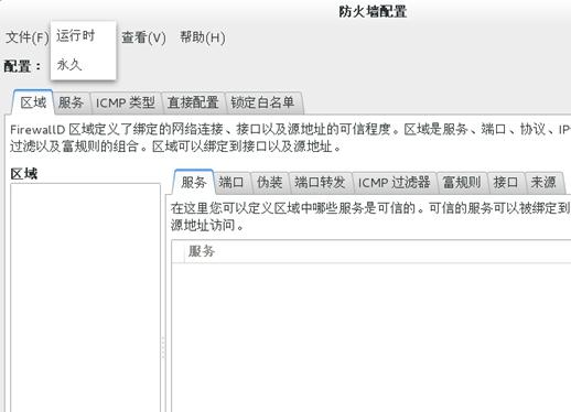 在运行时(Runtime)模式下更改防火墙的设定时,一旦您启动或者清除连接服务器的复选框,选择立即生效。在 Permanent模式下更改防火墙的设定,仅仅在重新加载防火墙或者系统重启之后生效。可以使用 文件菜单下的重新加载图标,或者点击 选项菜单,选择 重新加载防火墙。