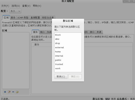 要设定一个将要被分配新接口的分区作为默认值,则启动 firewall-config,从菜单栏选择选项卡,由下拉菜单中选择修改默认区域,出现默认区域窗口见图 11。从给出的列表中选择您需要用的分区作为默认分区,点击确定按钮即可。