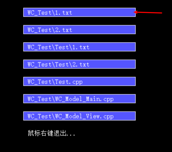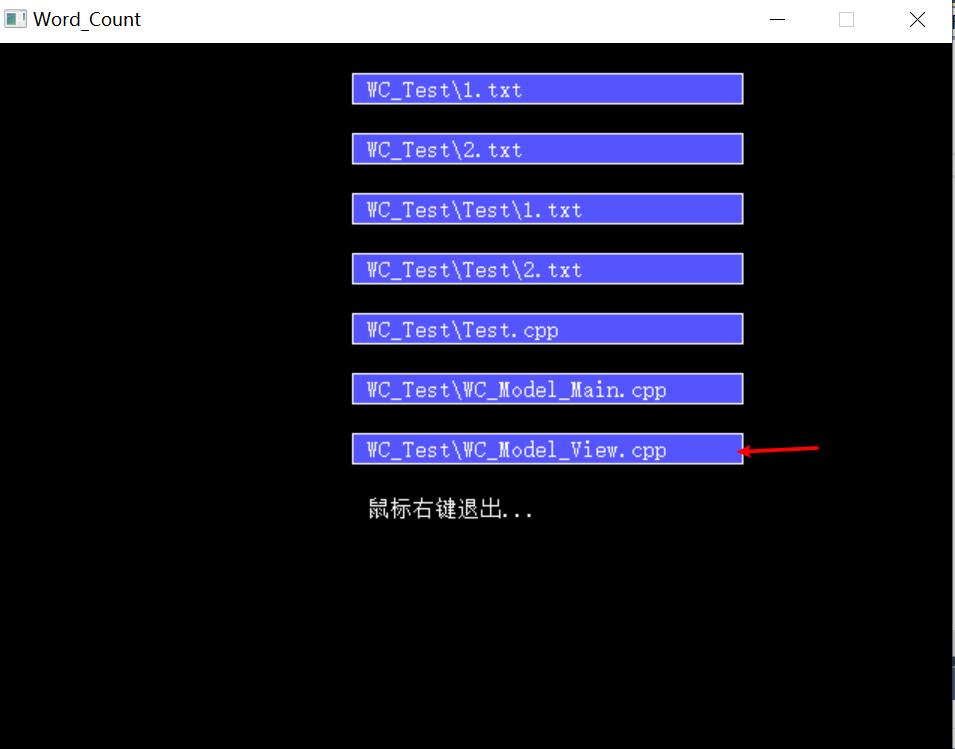 // 初始化图形窗口 initgraph(640, 480); FileIo F; FileIo_View V; string Path = "WC_Test"; vector<string> Fio_Files; MOUSEMSG Mou; // 定义鼠标消息 F.Get_Fio_Files(Path, Fio_Files);//得到路径下的文件 V.Fio_File_Out(Fio_Files); //显示文件 do{ Mou = GetMouseMsg(); if (Mou.uMsg == WM_LBUTTONDOWN){ if (Mou.x >= 220 && Mou.x <= 440){ int i = V.Fio_File_ID(Mou.x, Mou.y, Fio_Files.size()); if (i == -1){ continue; } cleardevice();//刷新一次 略等于那个system(cls) F.Total_Fio_CPP(Fio_Files[i]); F.Total_Fio_CWL(Fio_Files[i]); V.Fio_Total_Out(1,F); _getch(); FlushMouseMsgBuffer();//清除鼠标缓存 cleardevice(); V.Fio_File_Out(Fio_Files); } } else if(Mou.uMsg == WM_RBUTTONDOWN){ closegraph(); return 0; } }while (true);