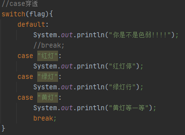 以上的case都不满足,name就执行default中的内容位置可以在switch语句中的任意位置,一般定义在switch语句的最后,如果切换位置,注意break定义,一对{}中的内容就要缩进一个tab键