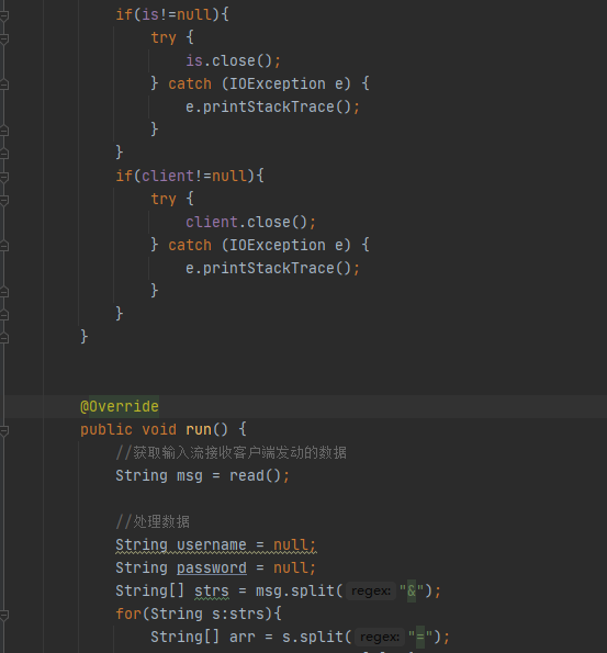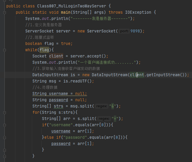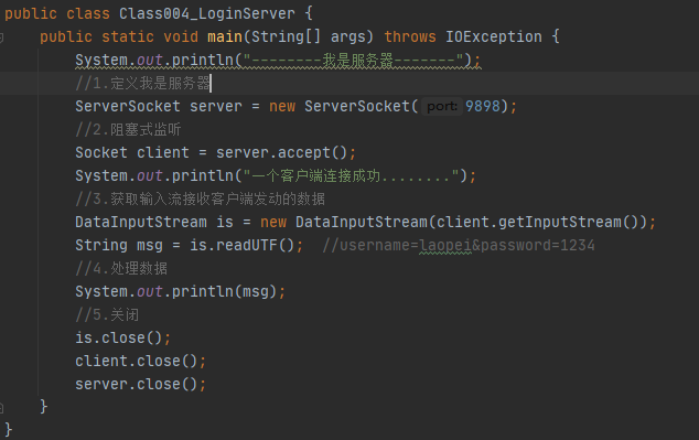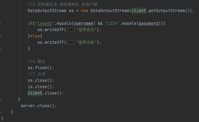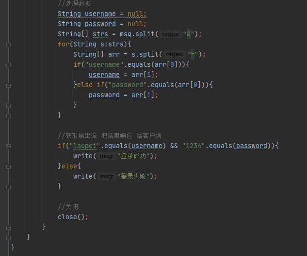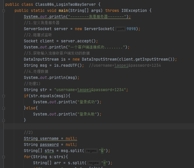 要求: 服务器端接收到用户输入的用户名与密码,与指定的laopei,1234比较是否相等,相等本地输出登录成功,不相等输出用户名或密码错误!!!
