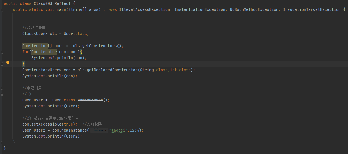 b.不能确定一个类型是否存在空构造,极有可能遇到运行时异常Constructor---> T newInstance(Object... initargs) 创建对象的同时调用当前构造器为对象初始化信息