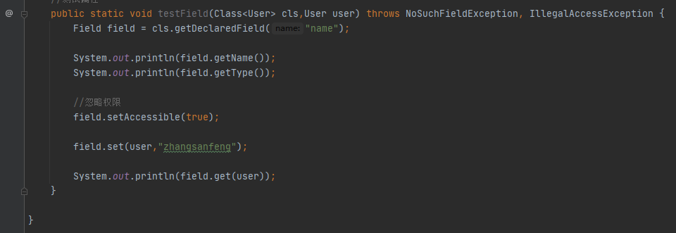 c.字段 getDeclaredField(String name) 返回 字段对象,该对象反映此 类对象表示的类或接口的指定声明字段。