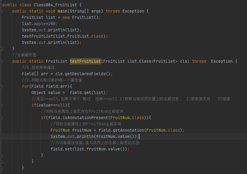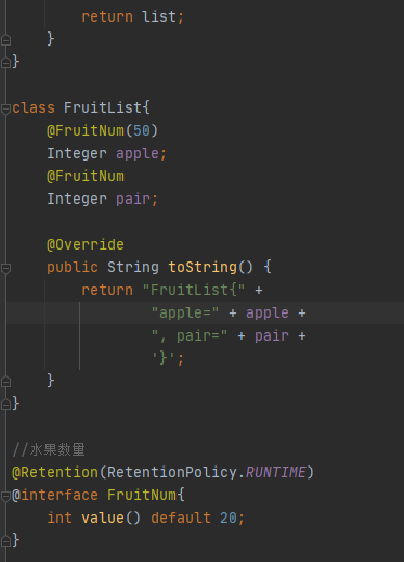 ①案例: 自定义水果清单 FruitList,int apple;int pair;为每种水果提供一个默认的进货数量,通过注解进行配置,注解类型: FruitNum 属性: int value();
