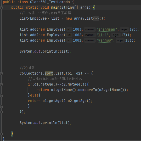 (1)题一:调用Collections.sort()方法,通过定值排序比较两个Employee(先按年龄比,年龄相同按姓名比),使用Lambda作为参数传递