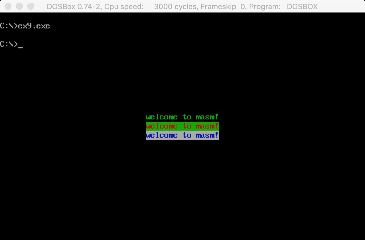 在屏幕的中间分别显示绿色,绿底红色,白底蓝色的字符串‘welcome to masm!’