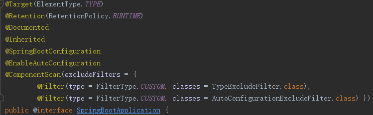 @SpringBootConfiguration可以看到@SpringBootConfiguration又被以下四个注解修饰:@Target(ElementType.TYPE)