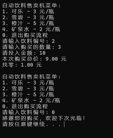 使用break语句,使当前while语句循环结束。在此场景中控制,当客户输入0时,取消贩卖机贩卖饮料并输出欢迎购买。