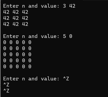 while (printf("Enter n and value: "), scanf("%d%d", &n, &value) != EOF) {