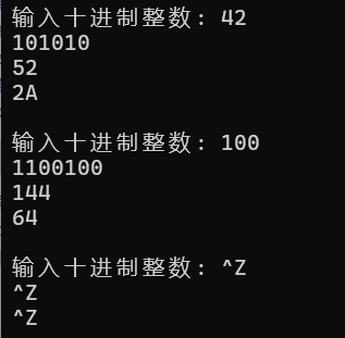 while (printf("输入十进制整数: "), scanf("%d", &x) != EOF) {