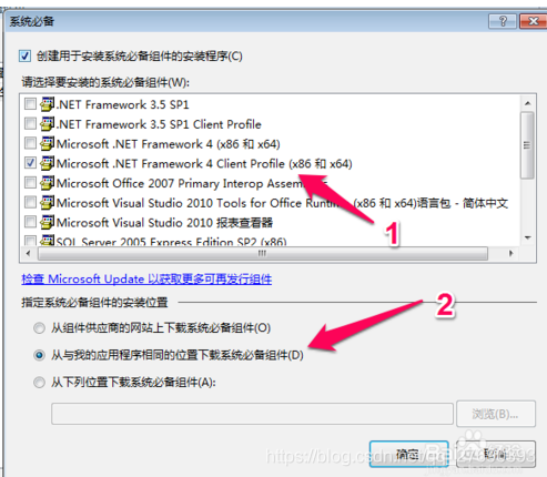 5.点击setup右键,选择“系统必备”——然后在弹出的系统必备中按照下图中红色箭头指示位置勾选.NET Framework 4,这个组件是小编编写的程序需要的组件,所以这里需要勾选这个组件,然后红色剪头2指示的是勾选【从与我的应用程序相同的位置下载系统必备组件】,勾选这个选项之后就可以把组件包括到我们打包好的软件安装包中了,用户在安装的时候不需要联网直接从安装包中安装就可以了,唯一的缺点就是安装包会比较大一点,如下图: