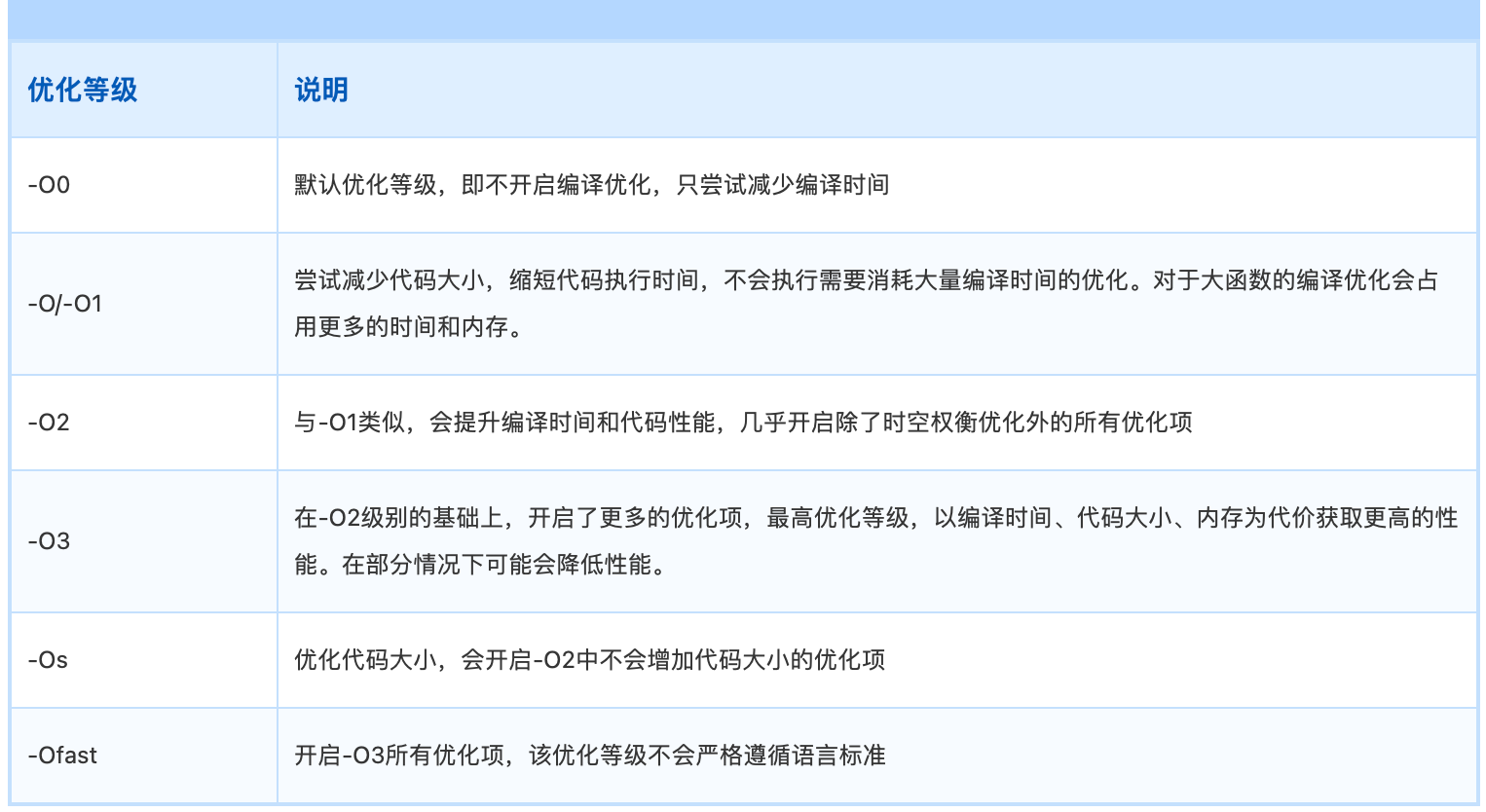 在默认情况下,gcc 编译器不开启编译优化,因为编译器的目标是减少编译时间、保证编译结果能够按照期望进行测试。 (开启编译优化编译时长会增加,bin文件大小也会增加,但最终代码执行效率会增加)