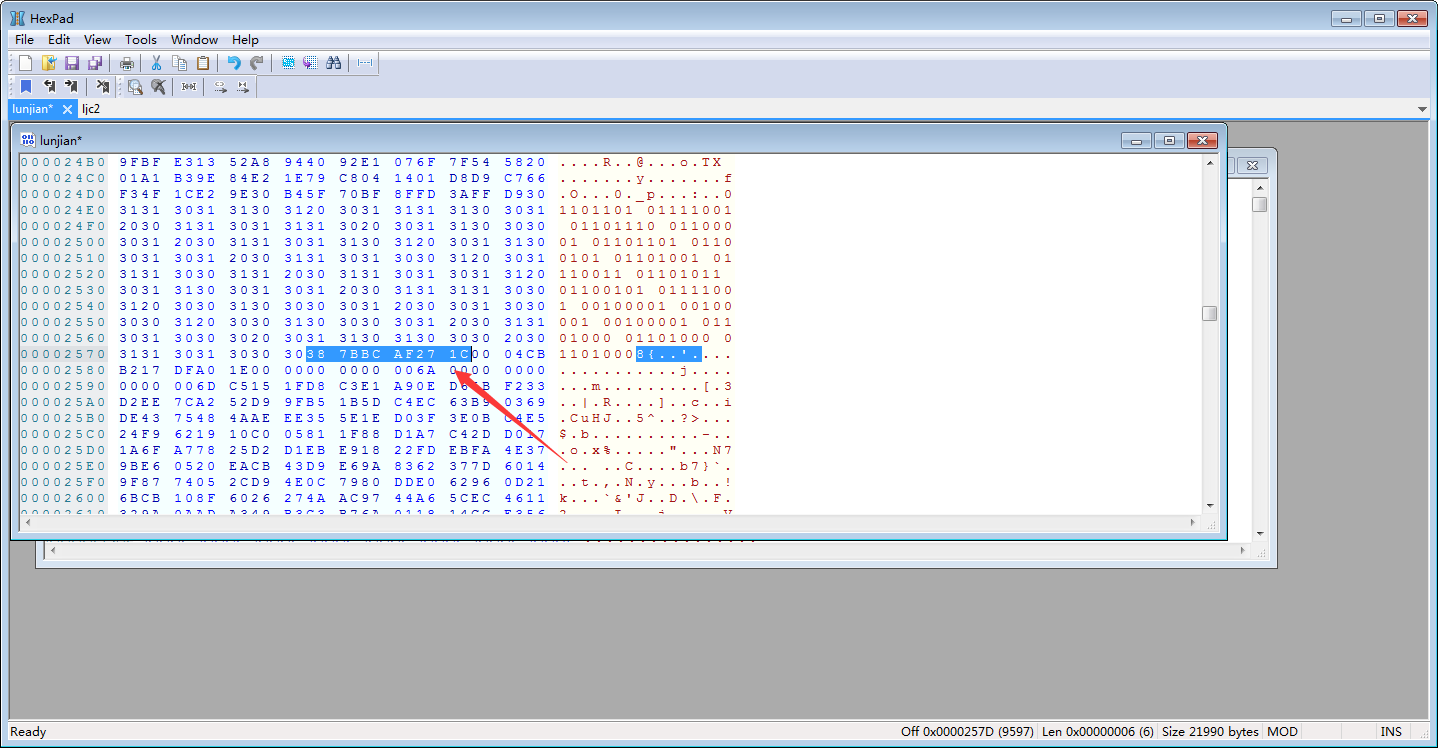 有字母被遮挡了,可能还有没有被发现的信息。我们继续查看二进制文件,发现01串这里有段熟悉的十六进制字符串。