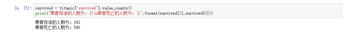 survived = titanic['survived'].value_counts() print("乘客存活的人数为:{}\n乘客死亡的人数为:{}".format(survived[1],survived[0]))