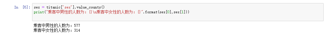 sex = titanic['sex'].value_counts() print("乘客中男性的人数为:{}\n乘客中女性的人数为:{}".format(sex[0],sex[1]))