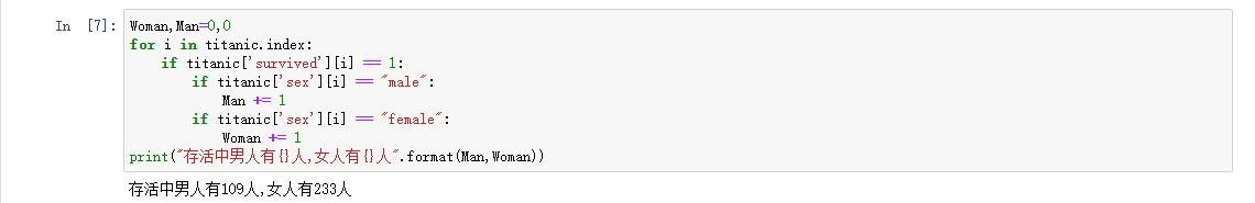 Woman,Man=0,0 for i in titanic.index: if titanic['survived'][i] == 1: if titanic['sex'][i] == "male": Man += 1 if titanic['sex'][i] == "female": Woman += 1 print("存活中男人有{}人,女人有{}人".format(Man,Woman))
