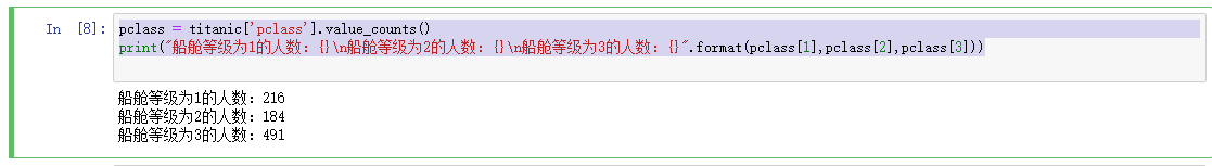 pclass = titanic['pclass'].value_counts() print("船舱等级为1的人数:{}\n船舱等级为2的人数:{}\n船舱等级为3的人数:{}".format(pclass[1],pclass[2],pclass[3]))