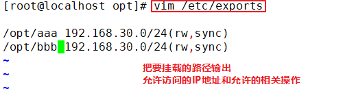 systemctl stop firewalld.service systemctl disable firewalld.service setenforce 0 yum install nfs-utils rpcbind -y systemctl start nfs.service systemctl start rpcbind.service systemctl enable nfs.service systemctl enable rpcbind.service mkdir /opt/accp /opt/benet chmod 777 /opt/accp /opt/benet echo 'this is accp web!' > /opt/accp/index.html echo 'this is benet web!' > /opt/benet/index.html vim /etc/exports /usr/share *(ro,sync) /opt/kgc 192.168.30.0/24(rw,sync) /opt/benet 192.168.30.0/24(rw,sync)