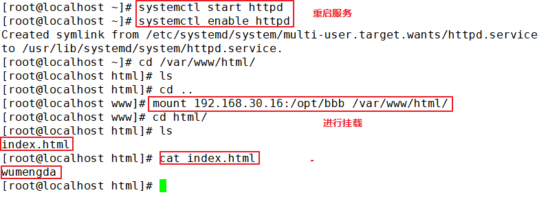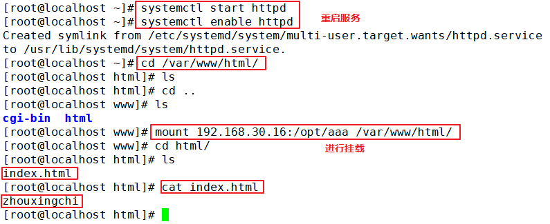 mount.nfs 192.168.30.16:/opt/aaa /var/www/html echo 'zhouxingchi' > /var/www/html/index.html vim /etc/fstab 192.168.30.16:/opt/aaa /myshare nfs defaults,_netdev 0 0
